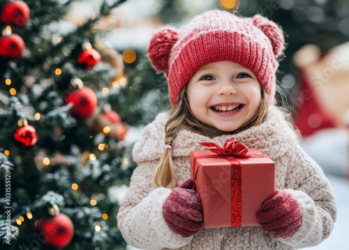 A smiling child in winter clothing stands joyfully in front of a beautifully decorated Christmas tree, holding a delightful red gift box.