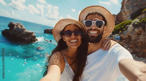 A smiling couple wearing summer hats and sunglasses captures a selfie on a sunny day by the ocean, surrounded by vibrant greenery, blue skies, and clear waters, radiating joy and vacation vibes