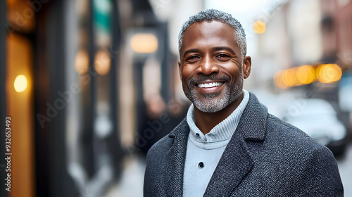 A smiling man in a gray coat stands on a city street, exuding confidence and warmth.