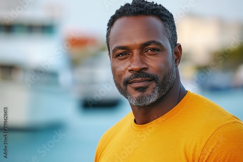 A smiling man in a yellow shirt poses by the water, conveying confidence and warmth.