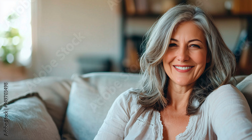 a Smiling middle aged woman sitting on sofa at home, single mature senior in living room