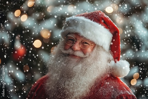 A smiling Santa Claus with a red hat and white beard, with Christmas lights and trees in the background