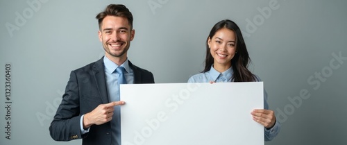 A smiling woman and man stand side by side, proudly displaying a large blank sign against a soft gray backdrop. Their bright expressions radiate positivity and collaboration, inviting viewers to