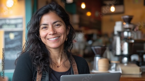 A smiling woman in a caf?, working on a laptop, showcasing a friendly atmosphere.