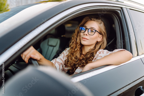 A smiling woman wearing glasses sits behind the wheel of a car and looks out the window. The female driver enjoys the sunny day. Concept of transportation, taxi. Lifestyle.