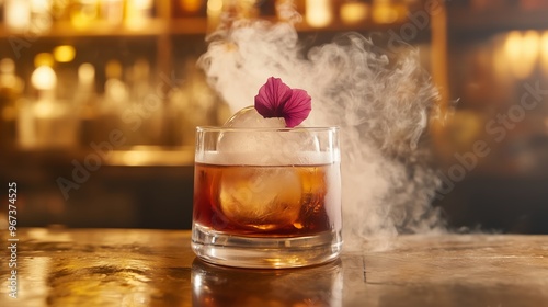 A smoky cocktail garnished with a flower sits on a bar, showcasing mixology in a lively setting during the evening