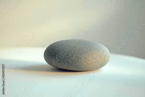 A smooth, oval, speckled grey stone rests serenely on a minimalist white surface. Soft light highlights its texture, creating a calm and natural aesthetic.