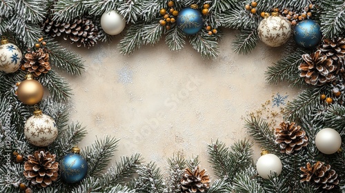 A snow dusted pine branch with stars, white, blue, and gold baubles adds a touch of elegance to a beige background.