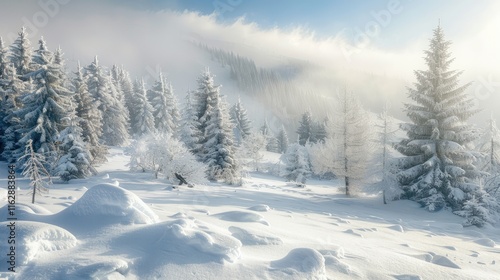 A snow-covered landscape with pine trees