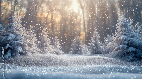 A snow-covered spruce forest and a sparkling snowy meadow during a gentle snowfall, with a warm winter light in the background, creating an abstract winter Christmas landscape.