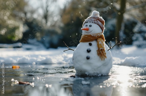 A snowman bravely stands in the middle of a pond, creating an extraordinary and unexpected winter spectacle