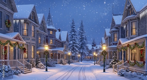 A snowy Christmas street with houses adorned with wreaths and lights, snowflakes falling, and a snow-covered path leading to a house with a red door.