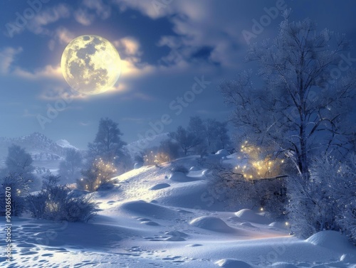A snowy winter night scene with a full moon illuminating a small village. The landscape is covered in a blanket of fresh snow.
