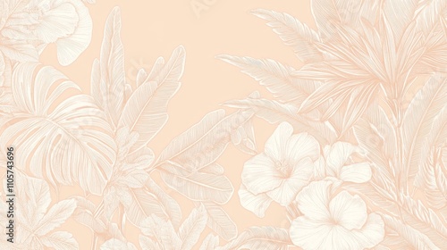 A soft peach background adorned with intricate white floral and leaf patterns.