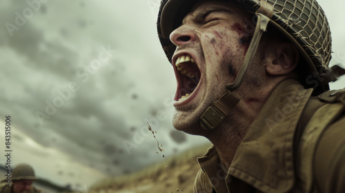 A soldier in a dramatic wartime moment, with an intense expression conveying the chaos and raw emotion of battle.