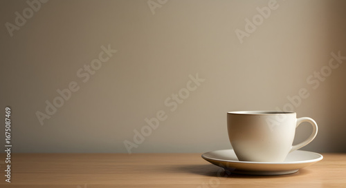 A solitary coffee cup on a saucer resting on a wooden surface, embodying a tranquil morning routine or a peaceful break with ample copy space