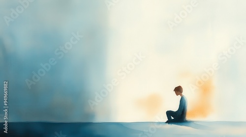 A solitary figure sits in contemplation, surrounded by soft hues of blue and warm tones, evoking sense of introspection and tranquility.