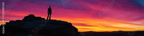 A solitary figure stands atop a rugged cliff, silhouetted against a breathtaking sunset filled with vibrant hues of orange and purple, symbolizing resilience and the spirit of exploration