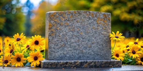 A solitary gray headstone stands amidst a field of vibrant yellow flowers, a poignant reminder of life's impermanence.