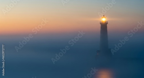 A solitary lighthouse stands as a beacon of hope piercing through the dense morning fog guiding ships safely to shore