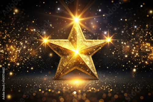 A solitary, shimmering star twinkles against a deep, velvety black background, casting a warm, celestial glow in the darkness, evoking feelings of wonder and magic.