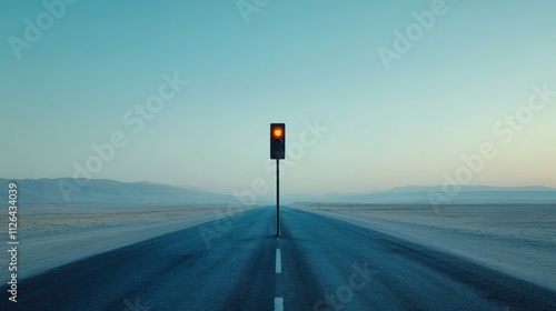 A solitary traffic light stands on an empty road in a vast, desolate landscape.