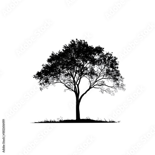 A solitary tree silhouette with detailed branches and leaves against a white background landscape view
