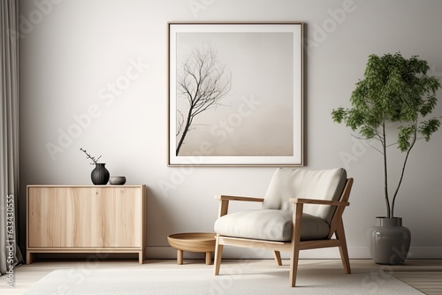 A sophisticated living room interior design featuring a mockup poster frame, a contemporary frotte armchair, a wooden commode, and trendy accessories. The wall is adorned with an eucalyptus design