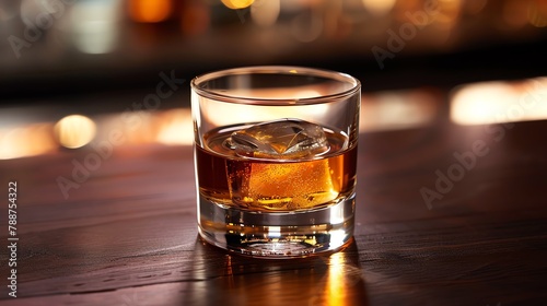 a sophisticated whiskey neat, in a classic lowball glass on a dark wooden table