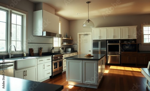 A spacious airy kitchen bathed in natural sunlight where stainless steel appliances gleamed and the warmth of the sun kissed the hardwood floor