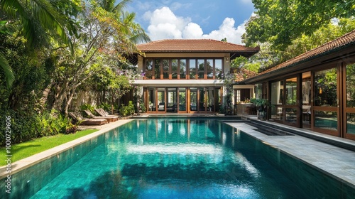 A spacious Bali-style house with large open windows, a stunning swimming pool, and a vibrant green garden with tropical trees and flowers.