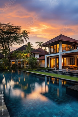 A spacious house with a pool in front, framed by palm trees under a sunset cloudy sky in a residential area. Luxury resort villa at dawn. Aerial view