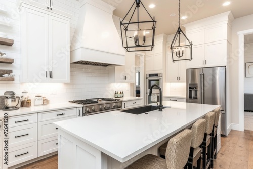 A spacious kitchen featuring a center island and a stove. Ideal for showcasing modern kitchen designs and cooking appliances