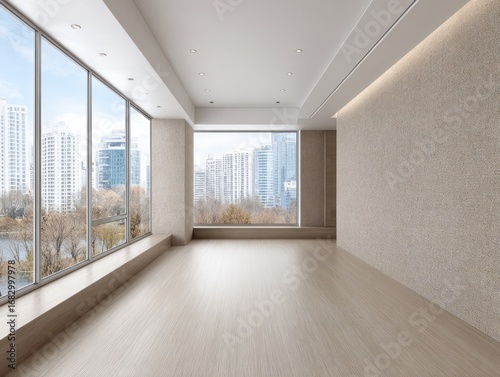 A spacious, modern interior room features large windows offering panoramic city views.