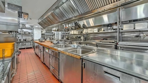 A spacious, stainless steel commercial kitchen showcasing various cooking equipment and workspaces for food preparation.