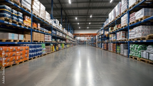 A spacious warehouse aisle filled with stacked goods on pallets.