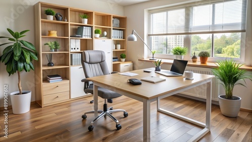 A spacious, well-organized home office with a clean desk, ergonomic chair, and an empty planner, promoting productivity and success.