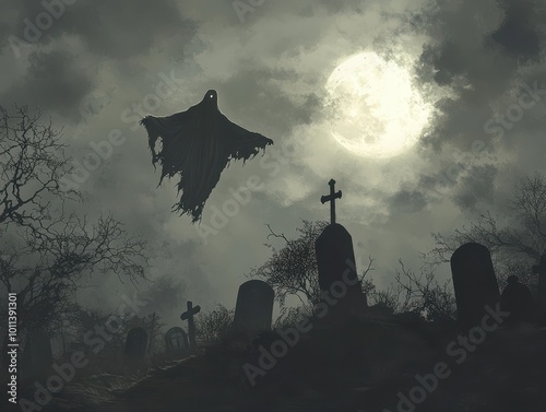A Spectral Figure Hovering Over a Graveyard Under a Full Moon