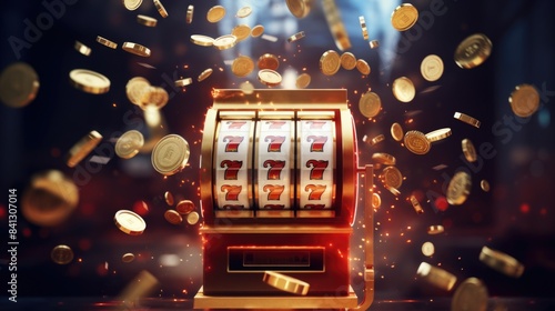 A spinning reel slot machine filled with gold coins, perfect for illustration or photography projects