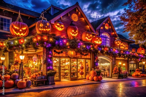 A spooky and festive nighttime scene featuring a sprawling Halloween-themed store with a grand entrance, illuminated by bright orange and purple lights and decorations.