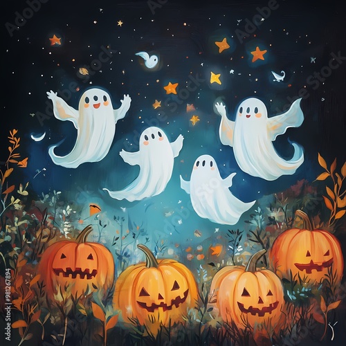 A spooky Halloween background featuring glowing pumpkins surrounded by eerie fog and dark shadows, perfect for festive decorations or holiday themes