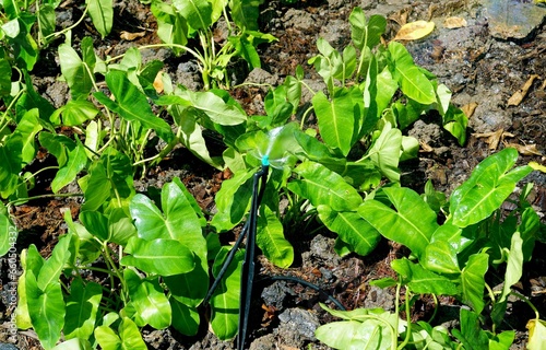 A sprinkler watering the garden in the afternoon, environment concepts.