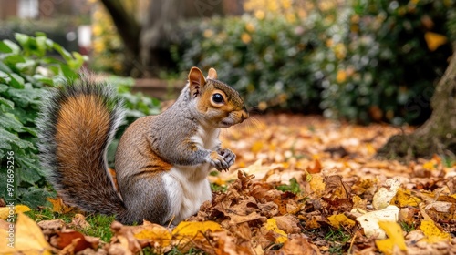 A squirrel in a garden or park, foraging among fallen leaves and natural debris.