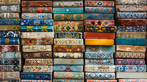 A stack of books with different colored covers. The books are arranged in a way that they are all different sizes and colors. Concept of diversity and variety, as well as a feeling of abundance