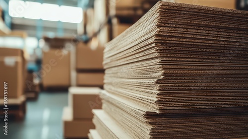 A stack of corrugated cardboard sheets is displayed, emphasizing their use in packaging, shipping, and eco-friendly material applications.