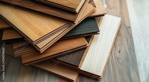 A stack of different wooden floor samples in various colors and textures