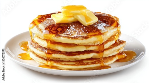 A stack of fluffy pancakes is displayed on a white plate, topped with melting butter and drizzled with golden syrup. The scene captures a simple yet inviting breakfast.