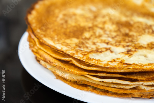 a stack of pancakes on a white plate
