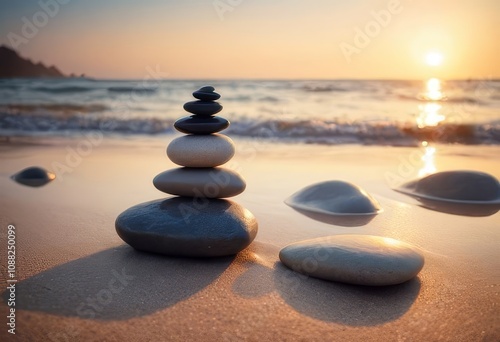 A stack of smooth stones on a sandy beach at sunset, with the sea and orange sky in the background