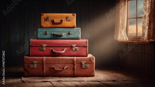 A stack of vintage suitcases sits bathed in sunlight near a window, evoking travel dreams.